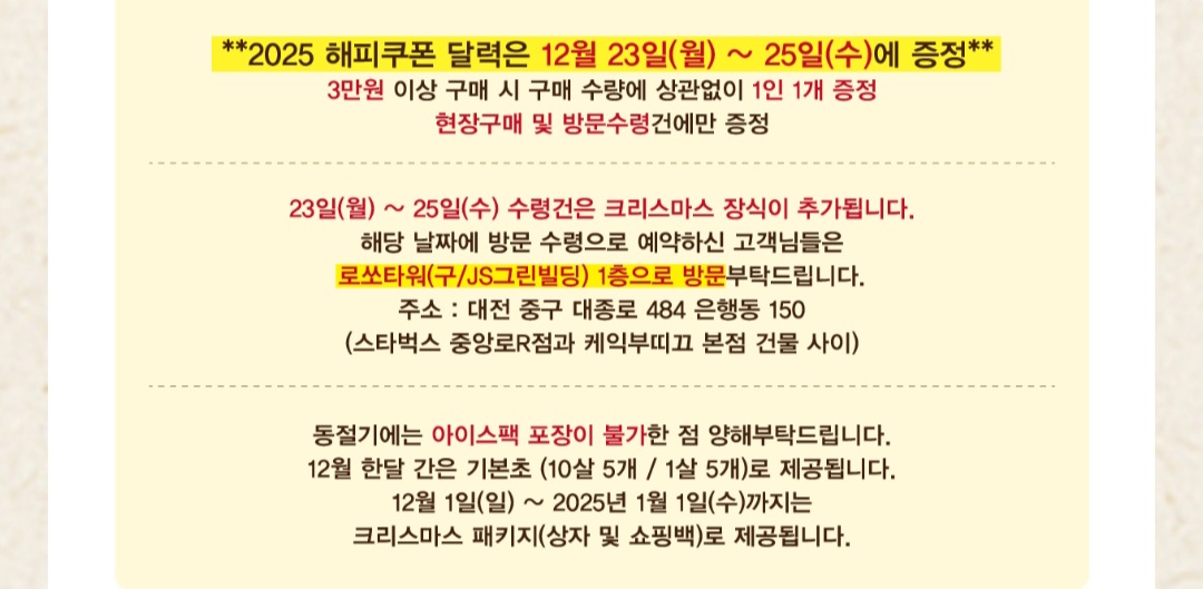해피쿠폰 달력 증정: 12월 23일부터 25일까지 3만 원 이상 방문 구매 시 1인당 1개의 2025 해피쿠폰 달력을 증정합니다.
